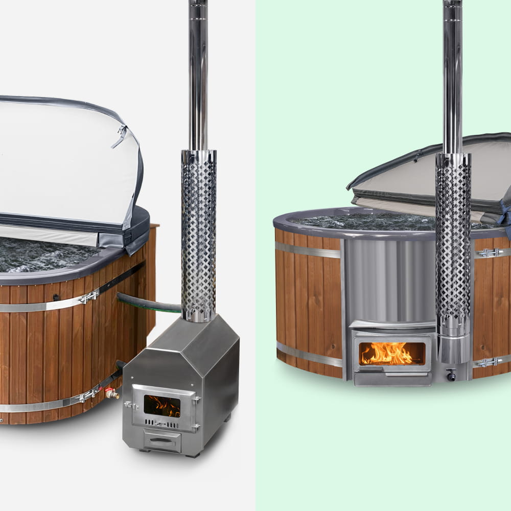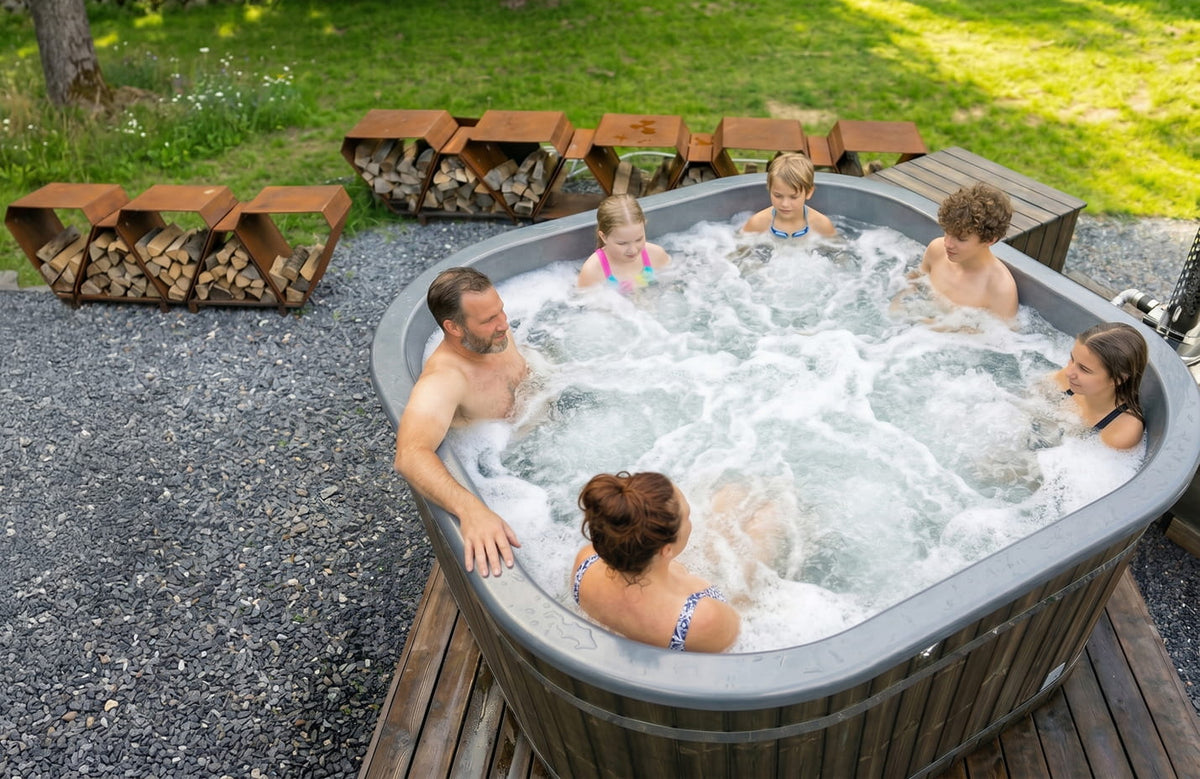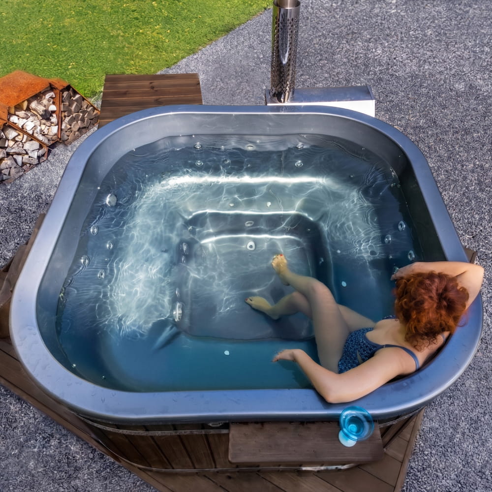 Kvadratinė malkomis kūrenama sūkurinė vonia 4–8 asmenims | Tikslinis masažas su 28 hidropurkštukais | Išorinis šildytuvas