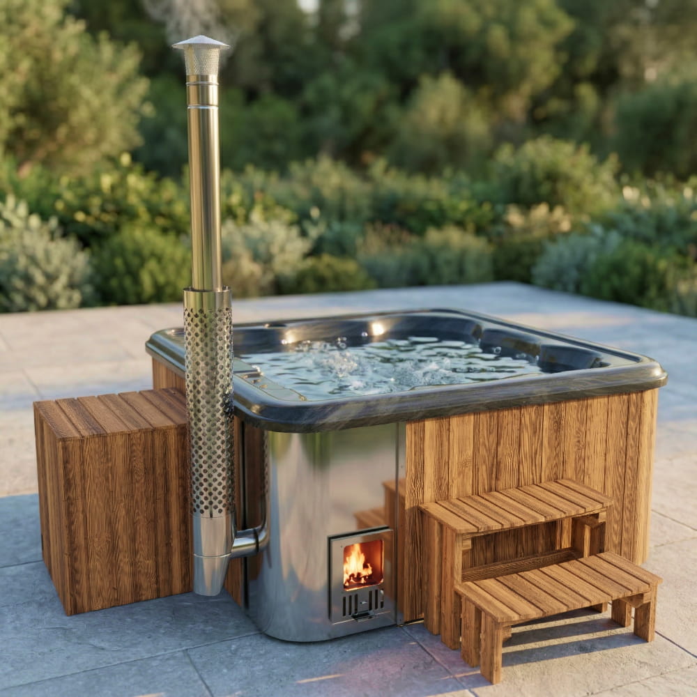 Aukščiausios kokybės smėlio filtro malkomis kūrenama sūkurinė vonia su purkštukais | Integruota krosnelė AISI 316 | 24 hidropurkštukai | 4–6 vietų