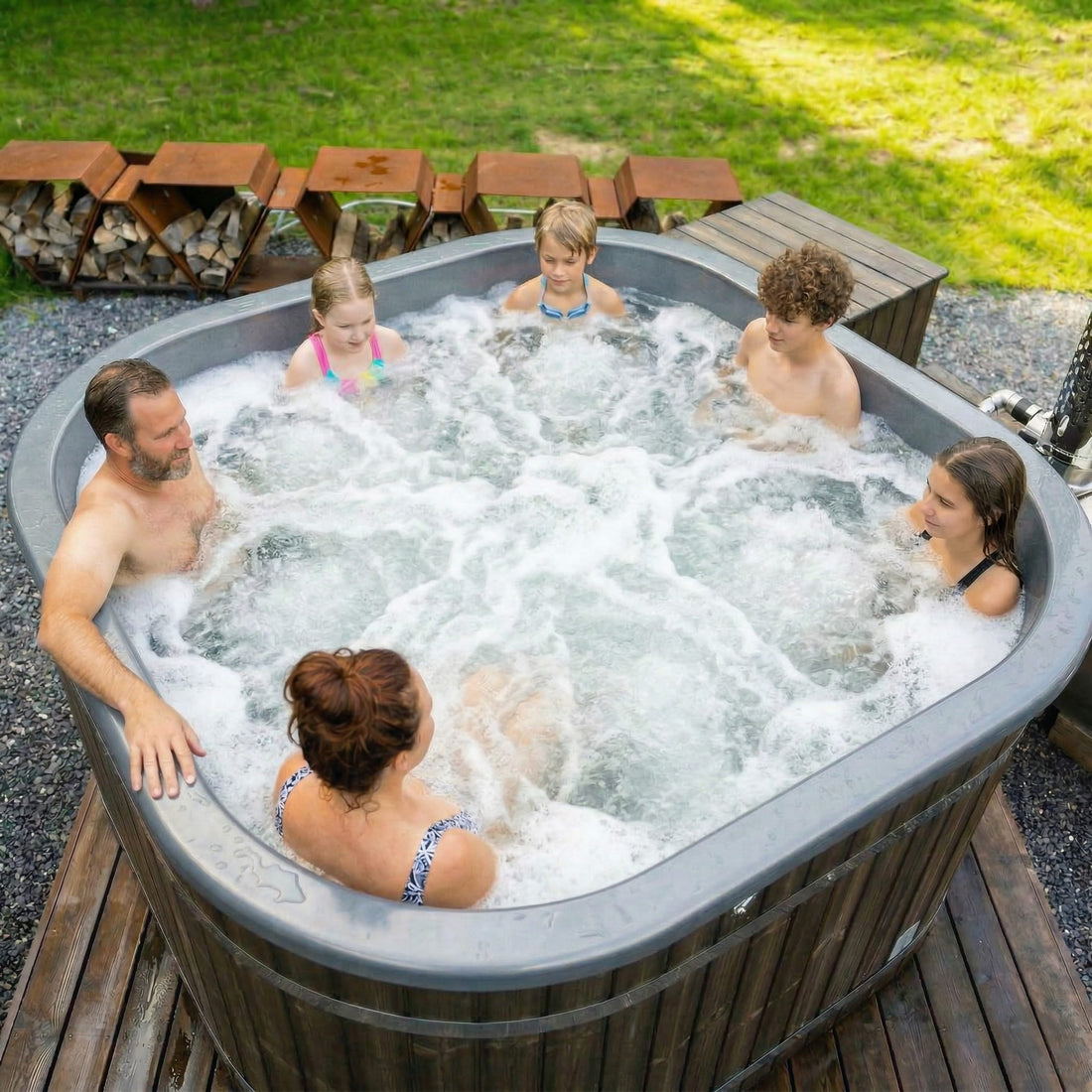 Kvadratinė malkomis kūrenama sūkurinė vonia 4–8 asmenims | Tikslinis masažas su 28 hidropurkštukais | Išorinis šildytuvas
